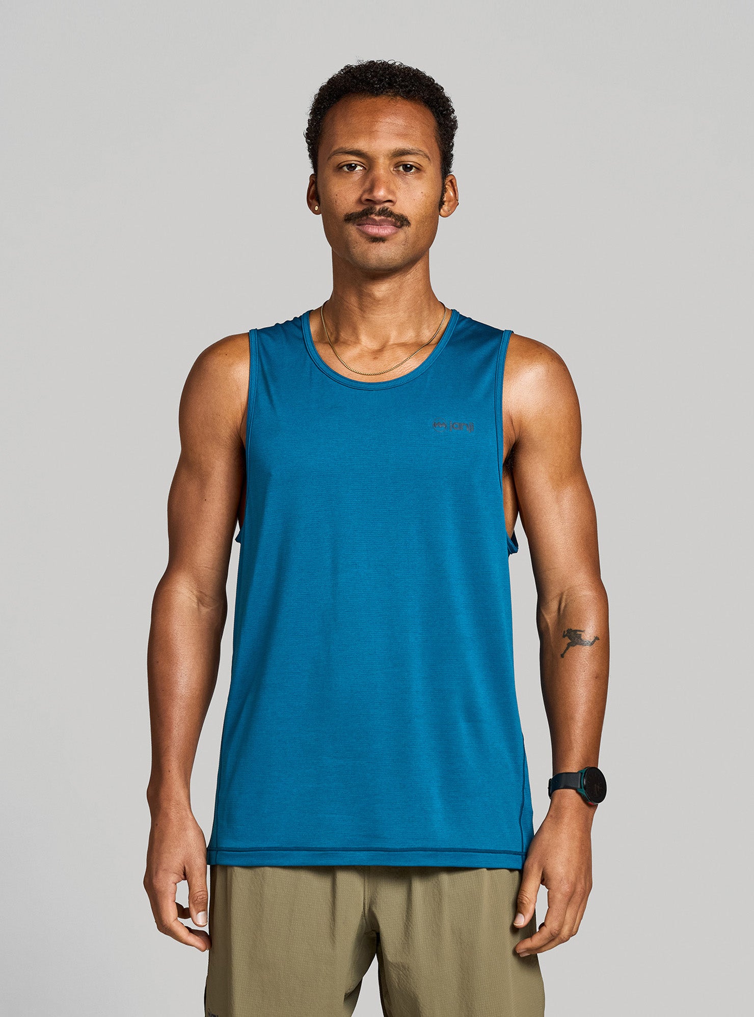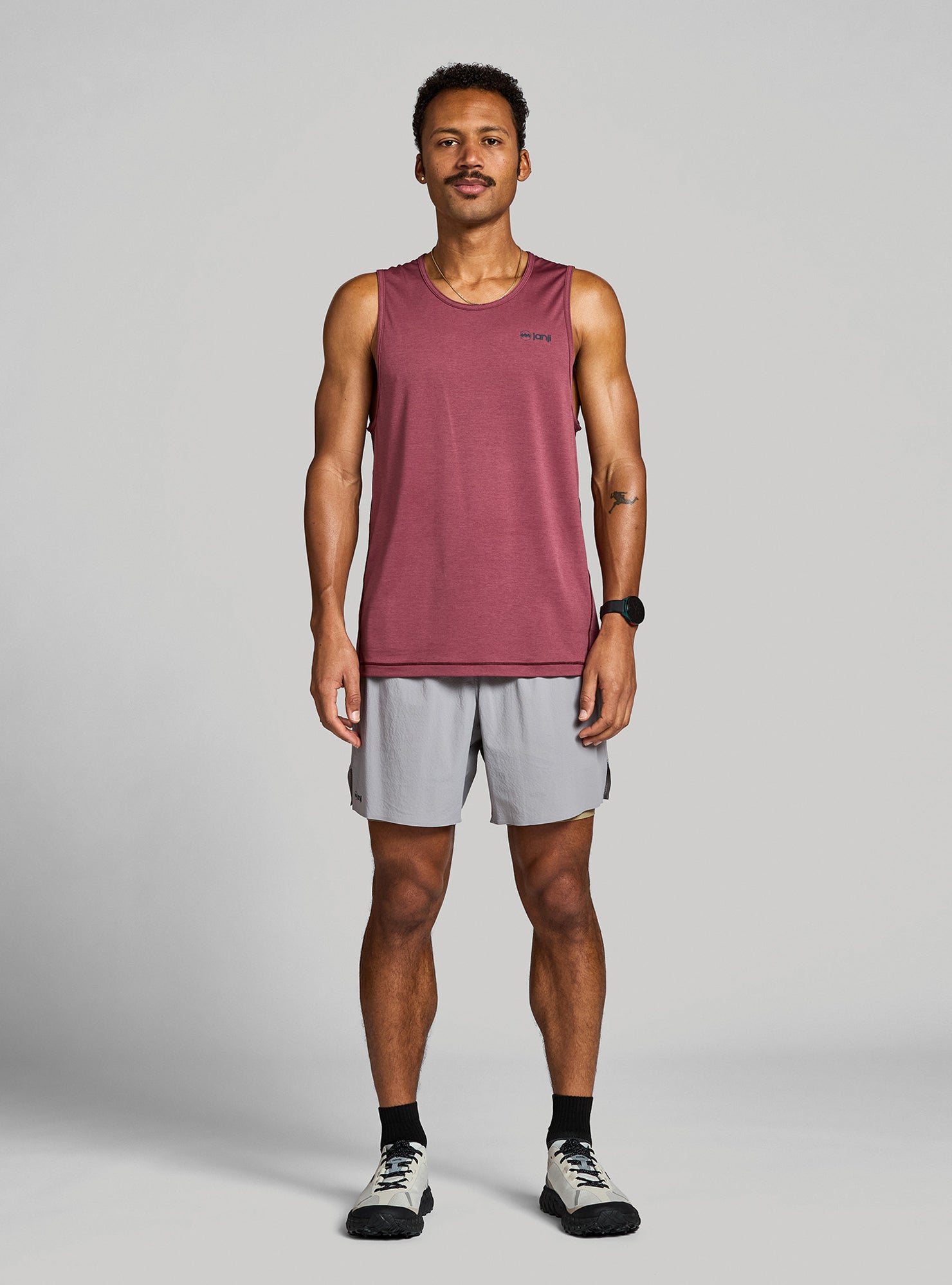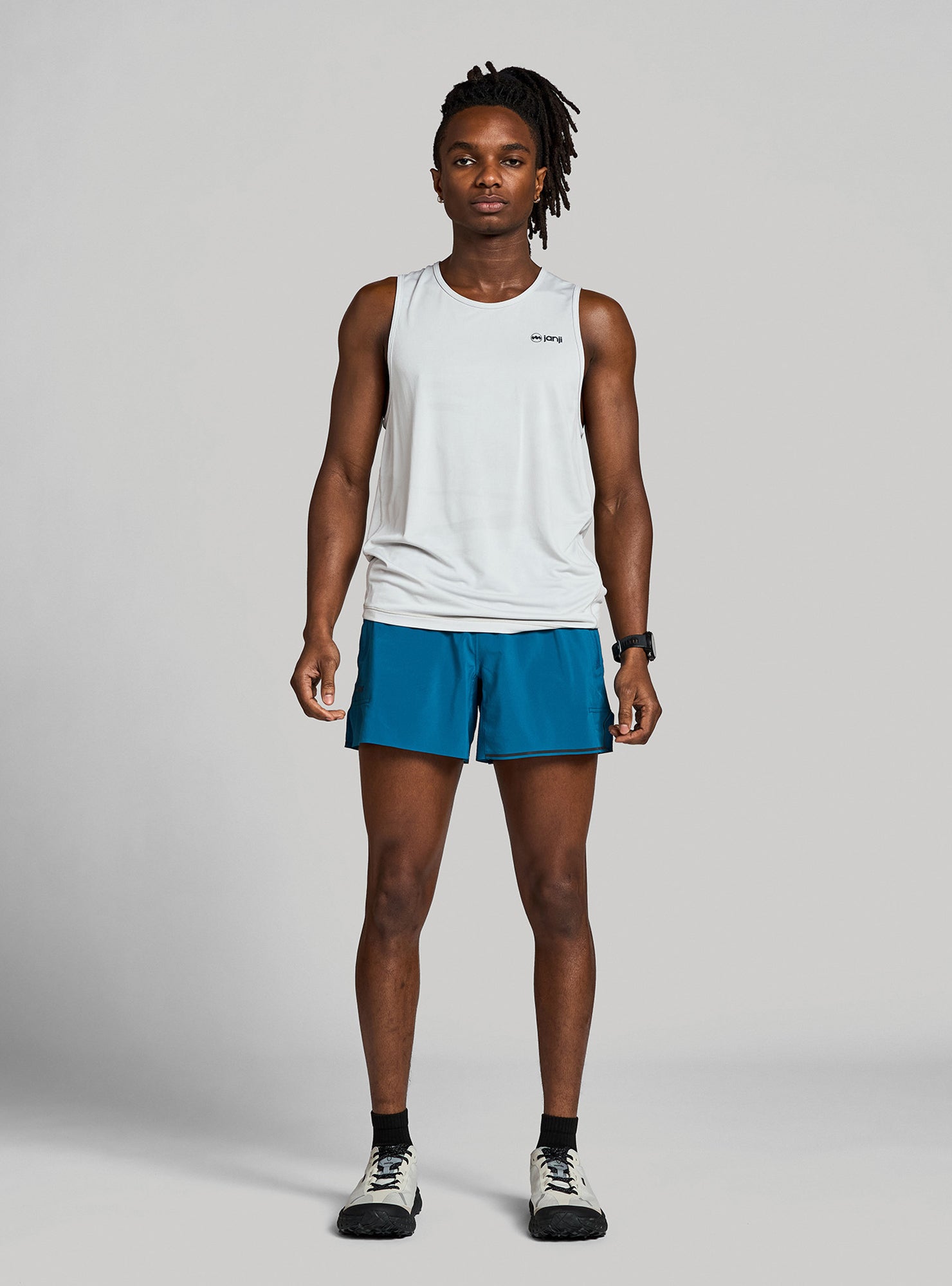 Janji signature reflective logo on front hem + “watermark” reflectivity on back increase visibility in low light